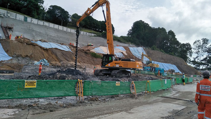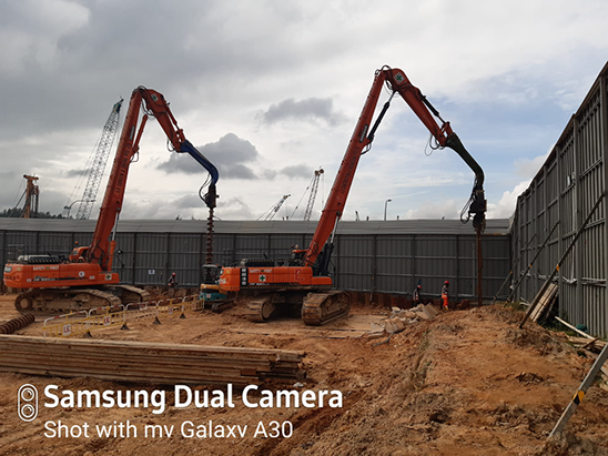 Excavator mounted auger bit machine can auger maximum 400mm diameter and18.0m length for install sheet pile, soldier and steel plate on soil condition Old Alluvium , Jurong Formation, Bukit Timah Granite (GV) . No vibration and Maximum noise level 10DBA