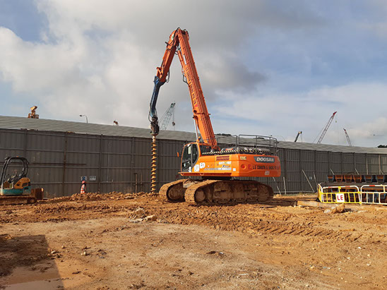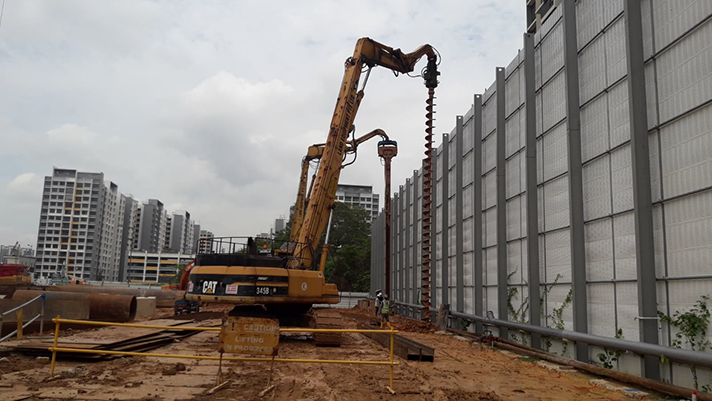 Excavator mounted auger bit machine can auger maximum 400mm diameter and18.0m length for install sheet pile, soldier and steel plate on soil condition Old Alluvium , Jurong Formation, Bukit Timah Granite (GV) . No vibration and Maximum noise level 10DBA